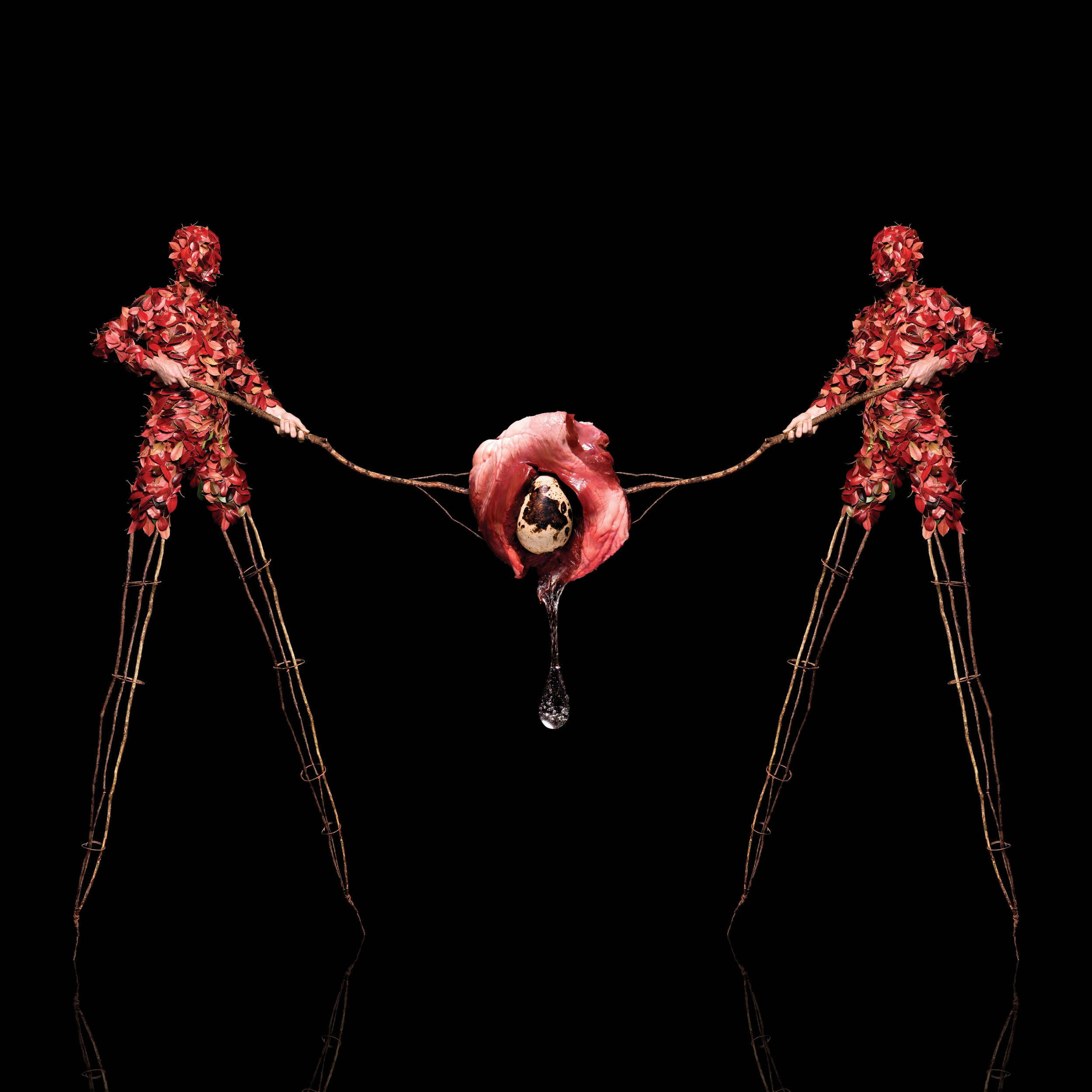 Coined by Giordano Bruno and later used by Baruch Spinoza, the Latin expression "Natura naturans" can be translated as "nature naturing." The neologism "naturare" means the typical action of nature, the production of its own reality as a principle of necessity and formation that governs things themselves. With "Natura Naturans," the two artists explore the ambiguous metamorphoses of a magmatic matter suspended in void, on the edge of perpetual change, in a process of creation and transformation starting from the construction of a set, the manipulation of sculptural bodies, and the transposition of objects of different two-dimensional scales. From the depths of black settings, mineral forms and plant epithelia, animal tissues and human body parts emerge in perpetual becoming, like the biomorphism of a creature halfway between a woman and a cocoon, balanced on the hollow of a branch, struck by a blinding stage light. In some works such as "The Expanding Universe," "Heart and the Soul," and "The Nectar of the Gods," one can perceive this close relationship of derivation and inseparable interdependence between living beings and the organic substances that make up nature, prefiguring a complex mechanism of transitions in the properties of matter—from solid to liquid and then to gas—triggered by the excessive imbalance of cords and weights in precarious equilibrium.
