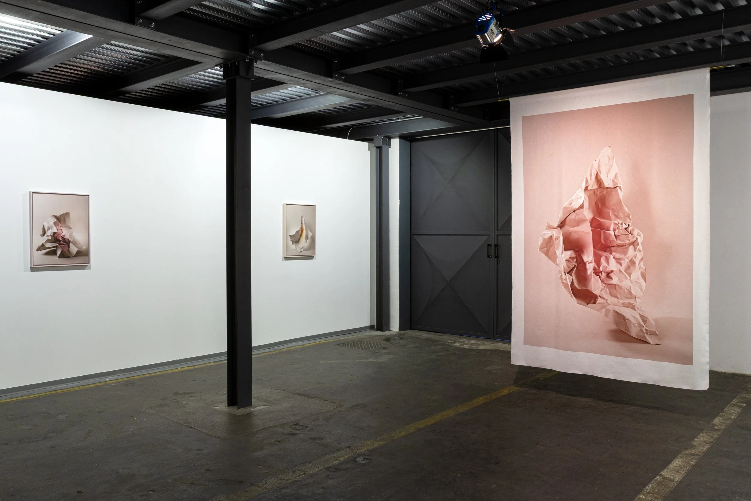 The works also recall a long artistic tradition: drapery, central since antiquity, becomes the protagonist. The folds of the paper replace the body, and light constructs its plastic presence. The images appear suspended, almost levitating in a chromatic space—grey, pink, or bluish—evoking painterly atmospheres and references to art history.